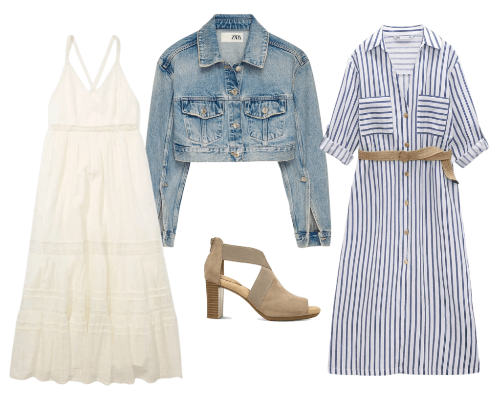 A cropped denim jacket with a light, casual dress is a perfect summer outfit. I think white just looks the best with denim, so one of the dress options I would wear is a bohemian-style white dress. It’s perfect for summer. If you want it a little bit more dress-y, a nautical-inspired striped collared dress is perfect. It still feels summery but the collar adds a bit more of a formal touch. Finish the look with a heeled sandal.
